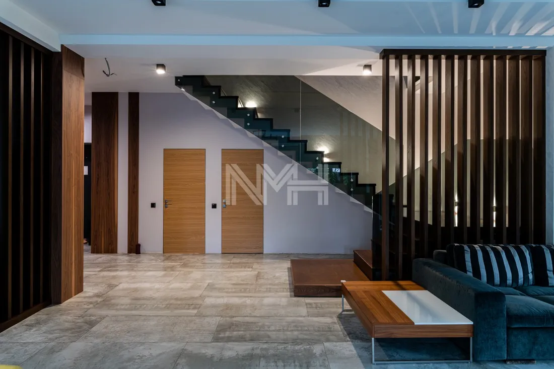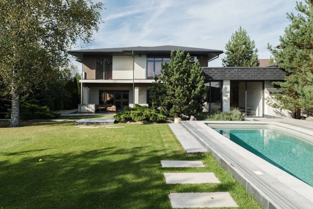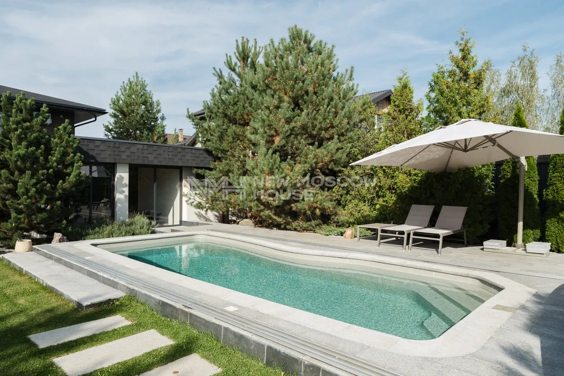 Современный дом 463,4 кв. м. с гаражом и с бассейном на участке 15 соток с ландшафтным дизайном в деревне Мартемьяново. Поселок расположен в 24 км от МКАД по Киевскому шоссе, Наро-Фоминский городской ...